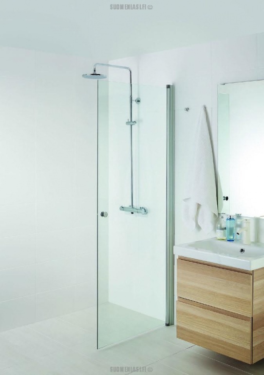 Kääntyvä kirkas suihkuseinä suoralla lasilla, joka voidaan kääntää seinän suuntaiseksi ja näin saada lisää vapaata lattiatilaa