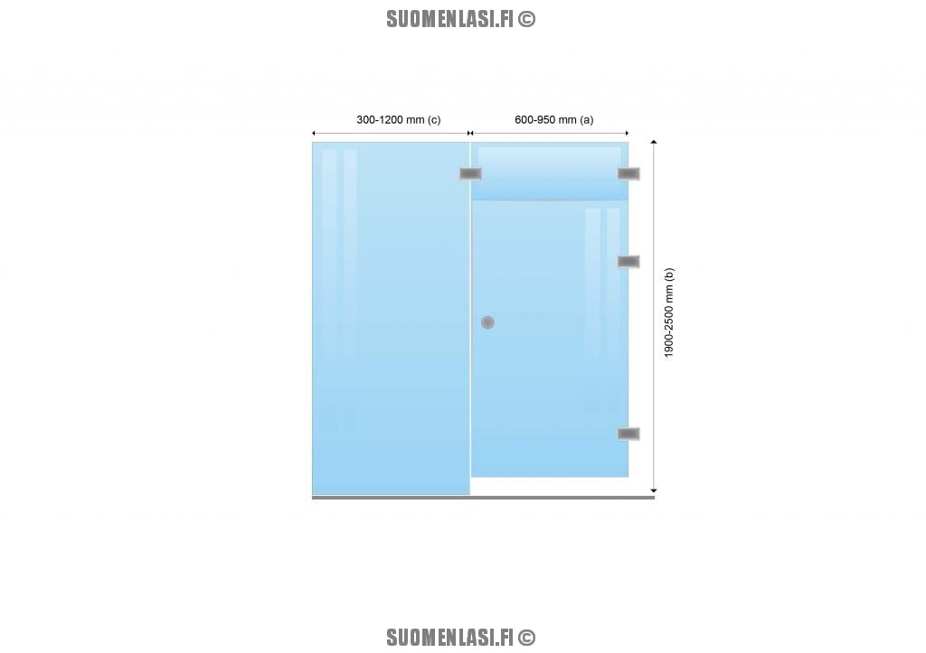 Lasi saranoidaan valmiiseen seinäpintaan ja sivulasi tulee alumiinilistoilla kiinni lattiaan, seinään ja kattoon.