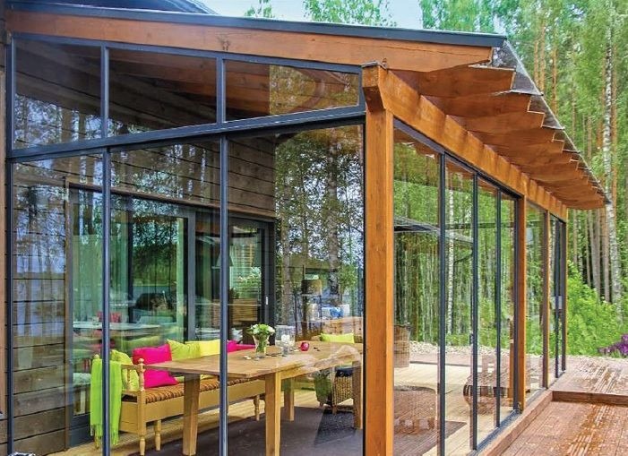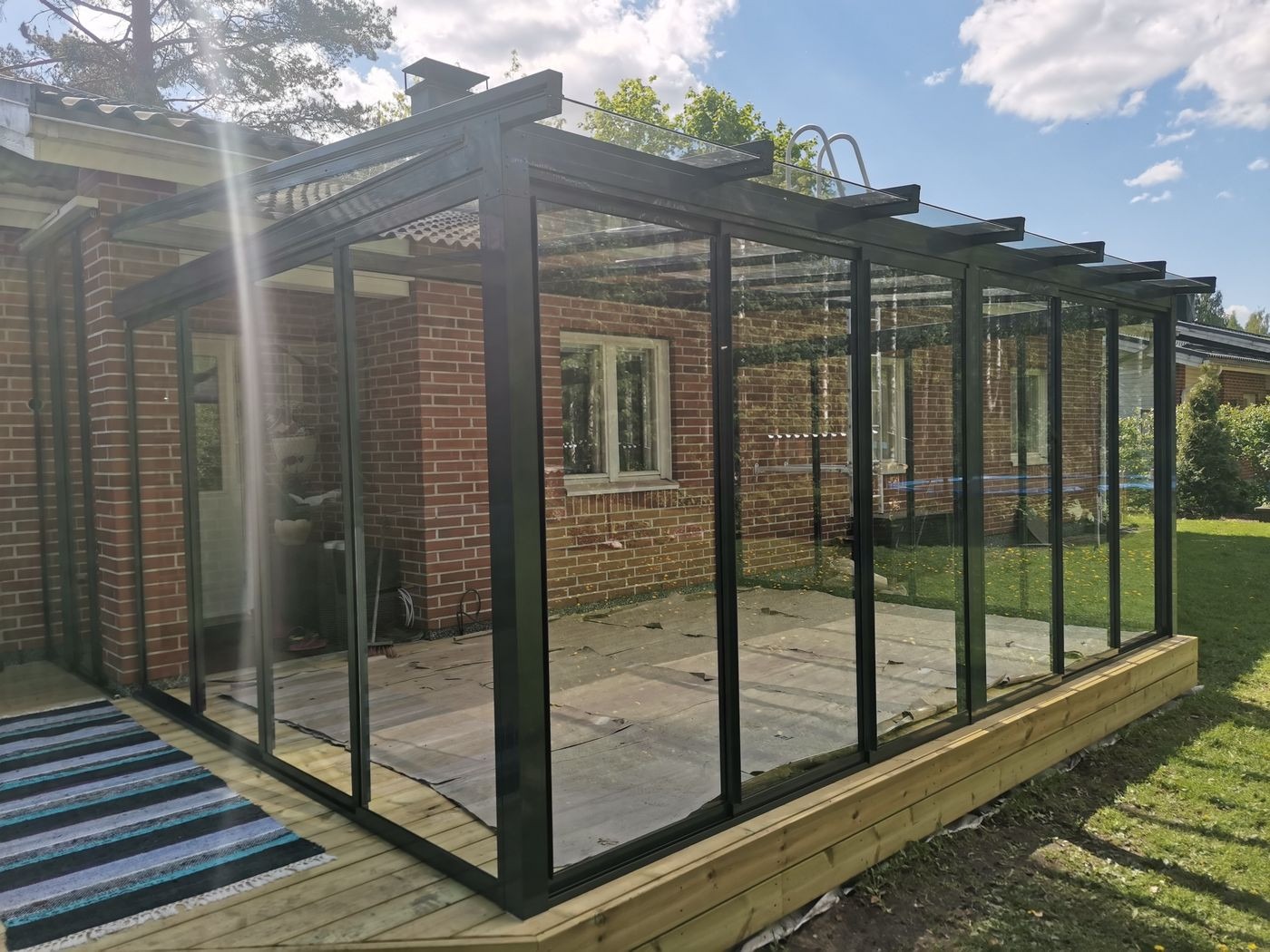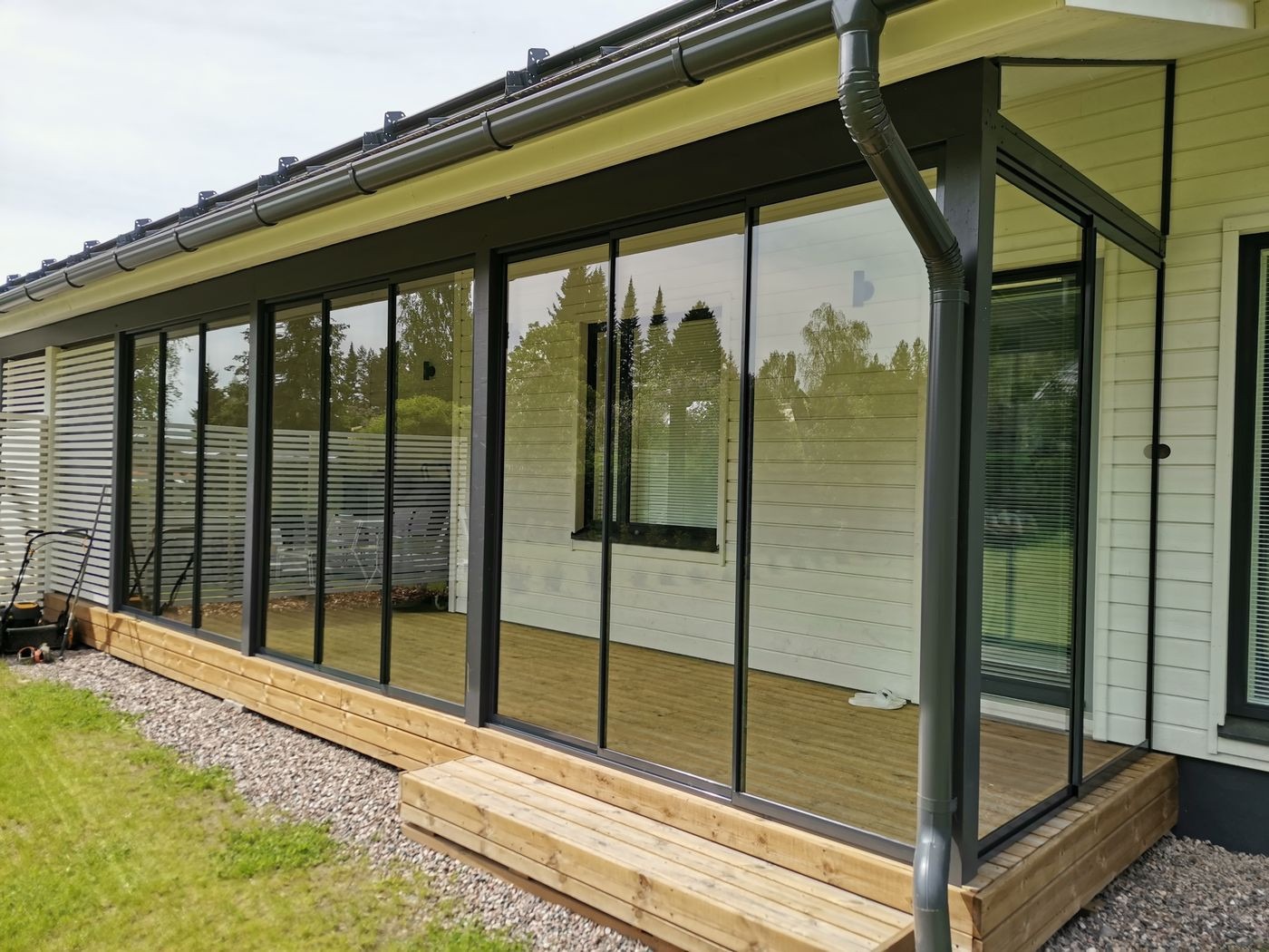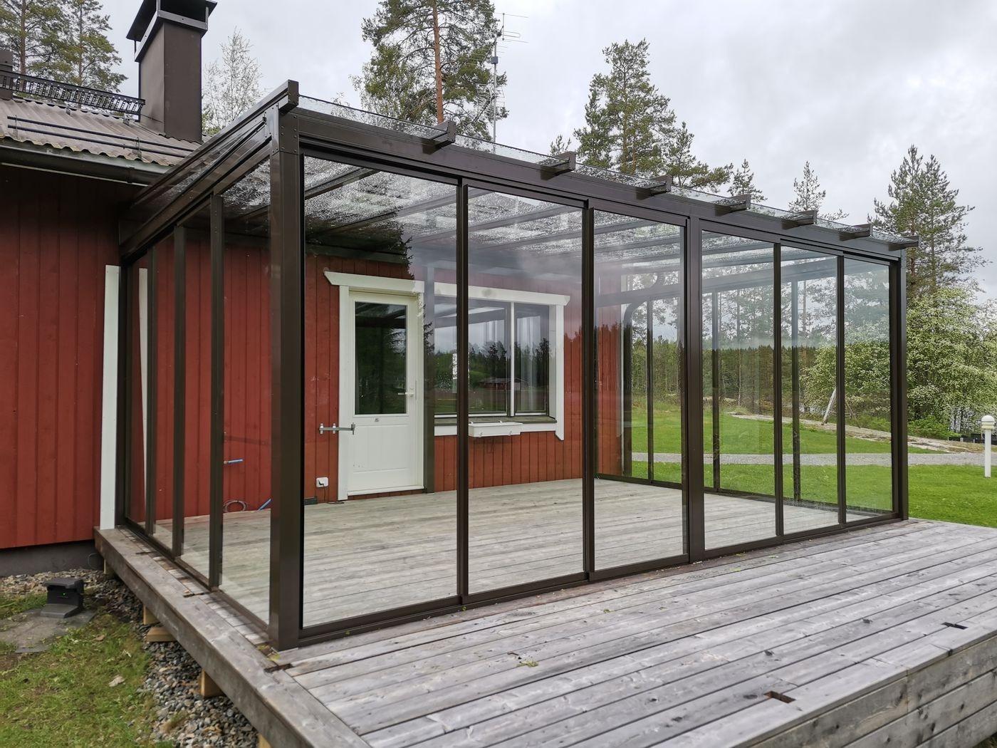 Toimitukseen kuuluu määrämittaan sahattuna runkoprofiilit, liukulasit, kattolasit, alumiiniruoteet, kolmiolasit listoineen, tarvittavat ruuvit ja asennusohje. Kokonaisuudesta tulee aina yhtenäinen ja toimiva.