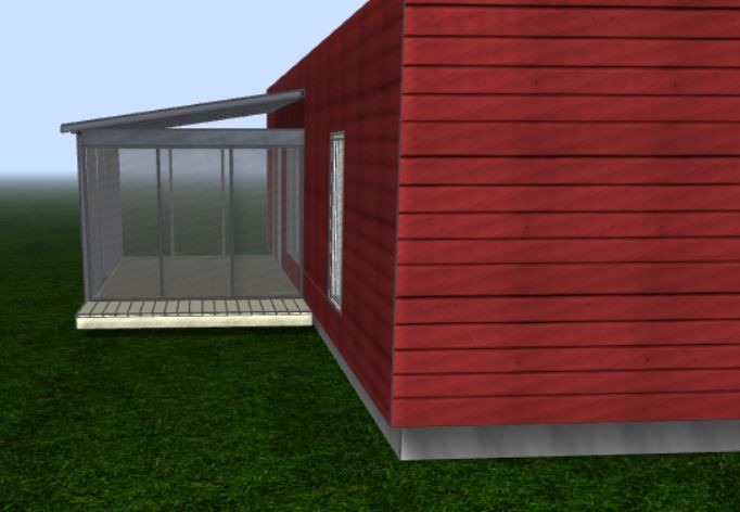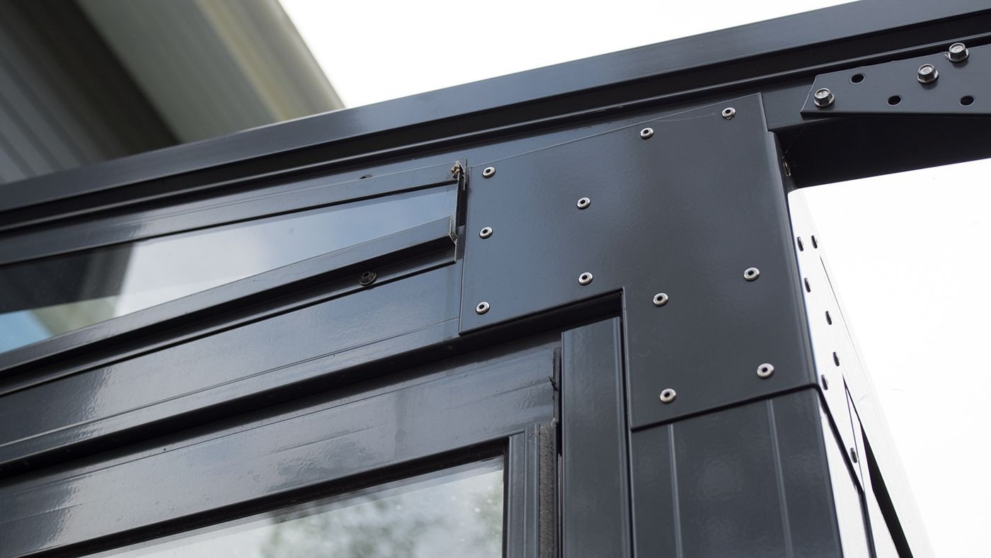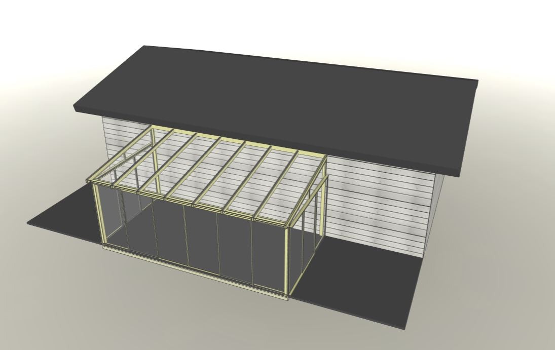 Kattolasit ja alumiiniruoteet muodostavat 200mm lipan etusivun lasituksen yli. Lyhyillä sivuilla toimitukseen kuuluu liukulasien päälle tulevat kiinteät kolmiolasit ja niiden kiinnityslistat.