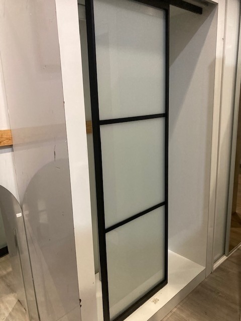 Yläkantava lasiliukuovi kirkkaalla lasilla ja mustalla ruudukolla.