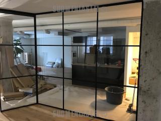 Lasi on jaettu 3 osaan mustalla jakopienalla ja reunoissa kiertää musta alumiiniprofiili.